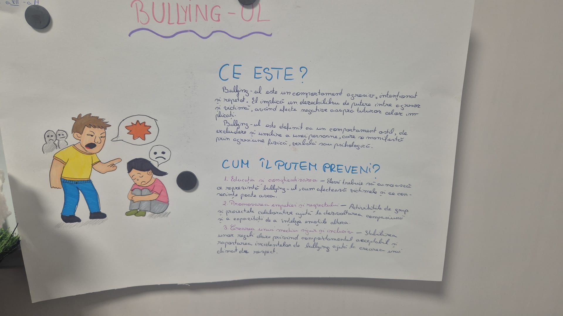 Consilierii școlari , Lerinț Monica, Ileana Balaci și Raluca Chirțan au desfășurat activități interactive adaptate vârstei elevilor, axate pe recunoașterea și exprimarea emoțiilor, gestionarea furiei, dezvoltarea empatiei și a abilităților de comunicare nonviolentă. Prin discuții deschise, jocuri de rol și exerciții practice, elevii au fost încurajați să își exprime trăirile, să înțeleagă impactul comportamentelor violente și să identifice alternative pașnice în situații de conflict.
